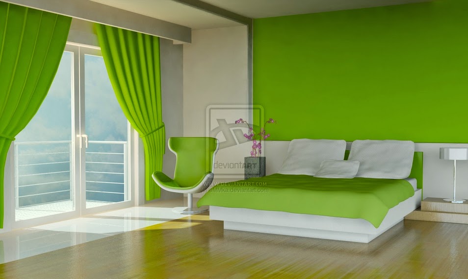 Salah satu cara mengganti warna cat kamar tidur anda dengan warna hijau ini dapat anda mulai dengan memili warna hijau yang lebih anda minati. Misal anda bisa memilih warna hijau tua pekat. Dengan warna ini anda akan merasakan suasana ruang yang agak mendekati gelap. Pada siang ari anda akan merasakan suasana ruang yang cukup nyaman dengan kondisi ruangan yang tidak begitu terang namun tak begitu terlalu gelap juga asalkan anda tetap memberi akses cahaya ke dalam ruang. Sedangkan pada malam hari suasana gelap bisa anda akali dengan menambahkan lampu tidur atau lampu cabai warna dengan daya yang kecil hanya untuk memberi sedikit cahaya dan tetap memanfaatkan pantulan sinar dari tembok. Atau jika anda lebih suka dengan warna hijau muda anda bisa menggunakan warna hijau muda ini. anda bisa merasakan suasana yang menyegarkan dan lebih semarak serta semangat. Suasana ini muncul karena dengan warna ini akan terasa sedikit agak mencolok dan bisa menggunggah anda untuk lebih semangat lagi.